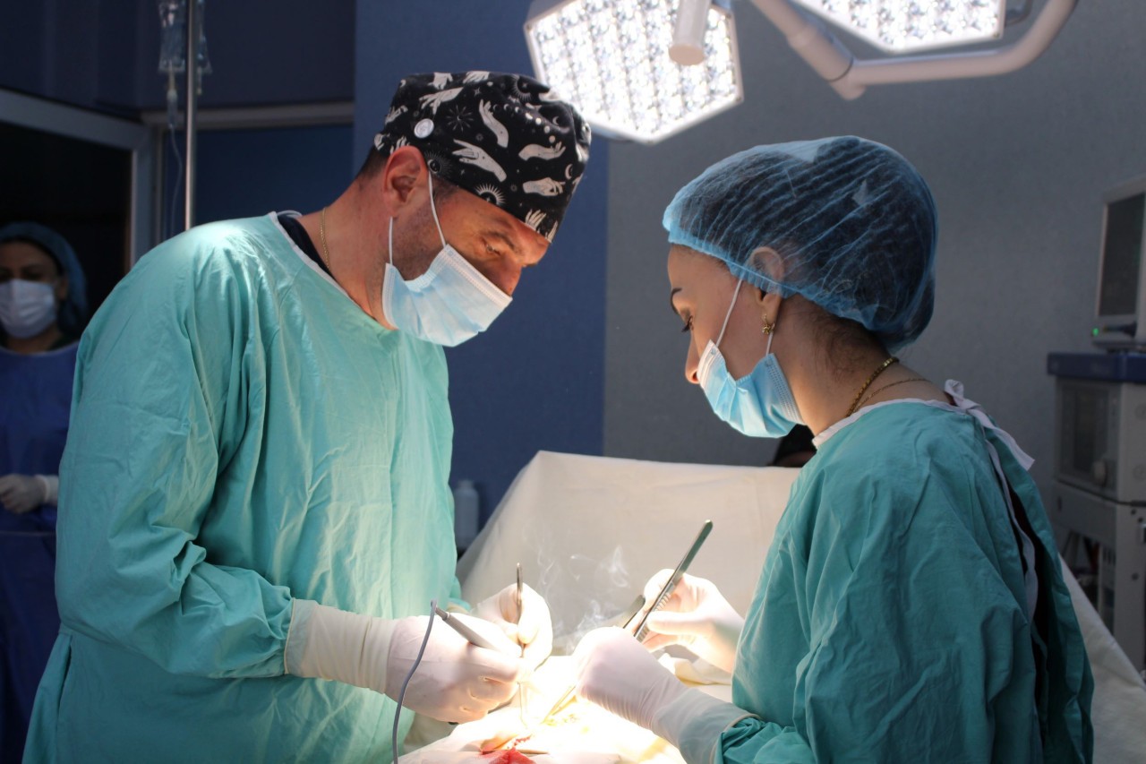 Հիվանդին իրականացվել է լայնածավալ վիրահատություն՝ լապարատոմիա, ուռուցքի ամբողջական հեռացում, մեծ ճարպոնի մասնահատում և փոքր կոնքի դրենավորում։ Վիրահատական նյութի պաթոհիստոլոգիական քննությունը ցույց է տվել բարձր աստիճանի (high grade) սարկոմա՝ բազմակորիզ բջիջների առկայությամբ և մեռուկի օջախներով, ինչը վկայում է ուռուցքի ագրեսիվ բնույթի մասին։